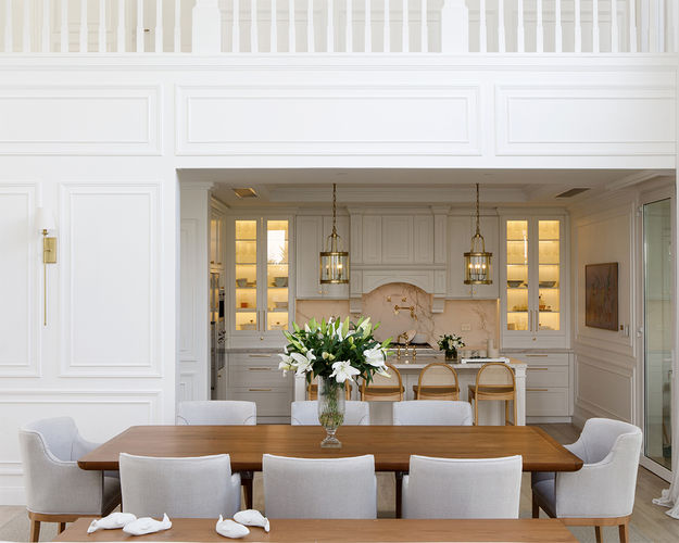 El diseño interior se basa en una estética costera refinada, con molduras clásicas, mobiliario de líneas simples y una paleta neutra que evoca la brisa y el mar. Elementos naturales como la madera, el lino y detalles marinos aportan frescura y equilibrio, logrando un hogar que refleja la distinción y el confort característicos de Los Hamptons.